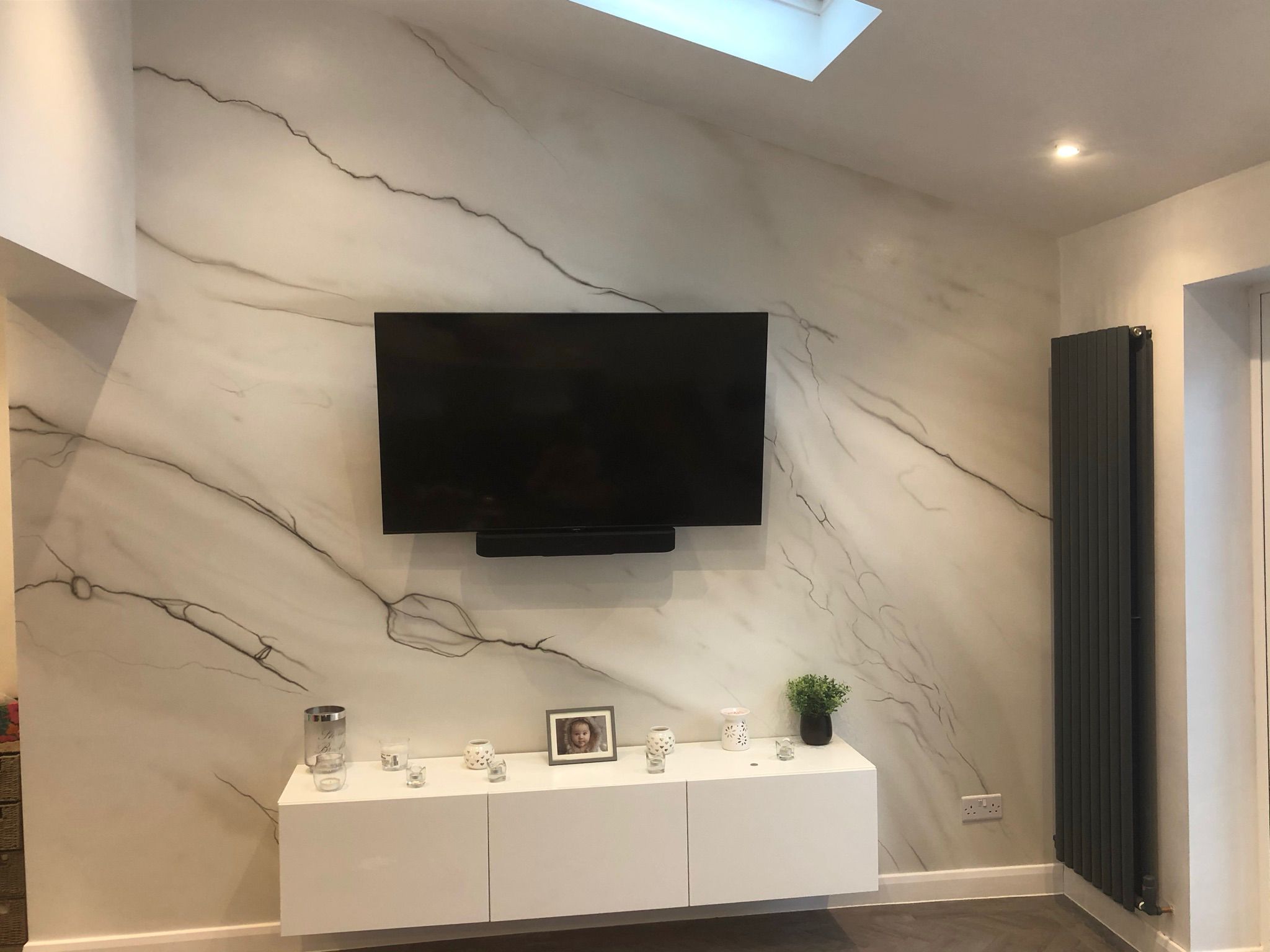 This customer in Armley wanted a sleek finish in their living room. To achieve the desired effect, we installed plug sockets, aerial points and data points discreetly into the walls at the correct height for the floating unit.